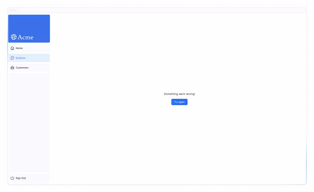 您将立即看到 error.tsx 启动,因为这是 /invoices 的子路由,其中定义了 error.tsx。